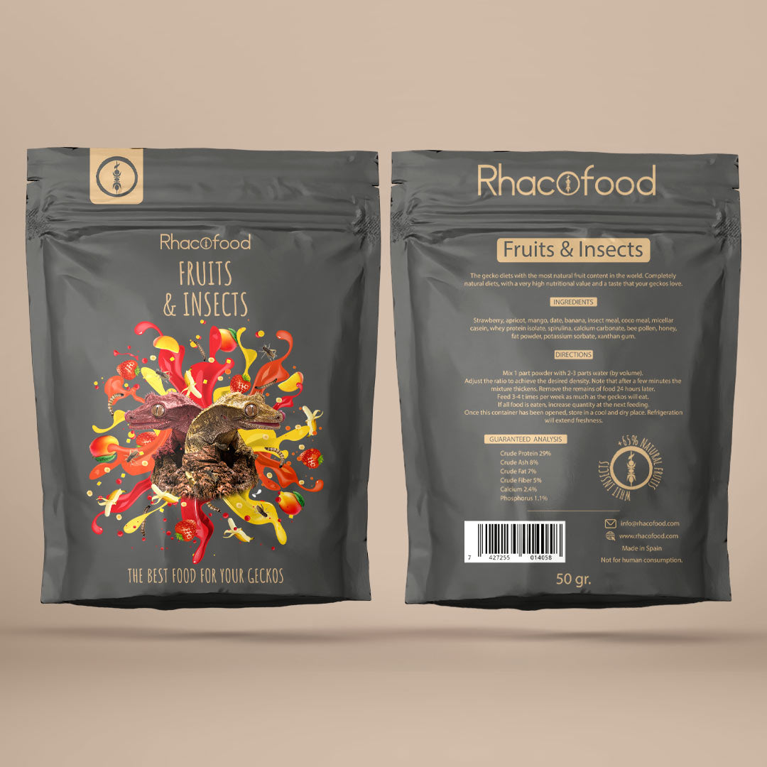With Fruits & Insects we achieve the adequate nutritional values to meet the needs of our geckos. This diet is best for breeders due to its high protein and fat content, but it also improves the growth rate of young animals. It is the perfect mix for those who don´t want to feed their geckos with insects or for geckos who don´t want to eat insects.